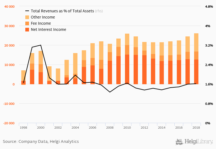 Historically, the bank’s revenues containing of interest, fee and other non-interest income reached an all time high of EUR 26,158 mil in 2018 and an all time low of EUR 6,785 mil in 1998. The average revenue in the last five years amounted to EUR 23,399 mil.