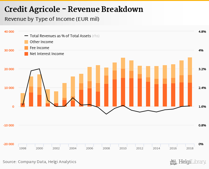 Credit Agricole generated total banking revenues of EUR 26,158 mil in 2018, up 6.14% compared to the previous year.