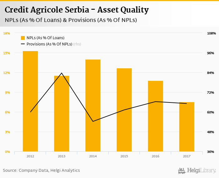 Credit Agricole Serbia's non-performing loans reached 7.51% of total loans at the end of 2017, down from 10.8% compared to the previous year. Historically, the NPL ratio hit an all time high of 15.3% in 2012 and an all time low of 7.51% in 2017.