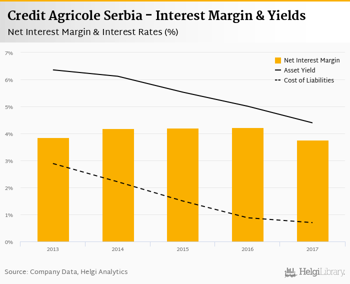 Credit Agricole Serbia's net interest margin amounted to 3.77% in 2017, down from 4.23% compared to the previous year.