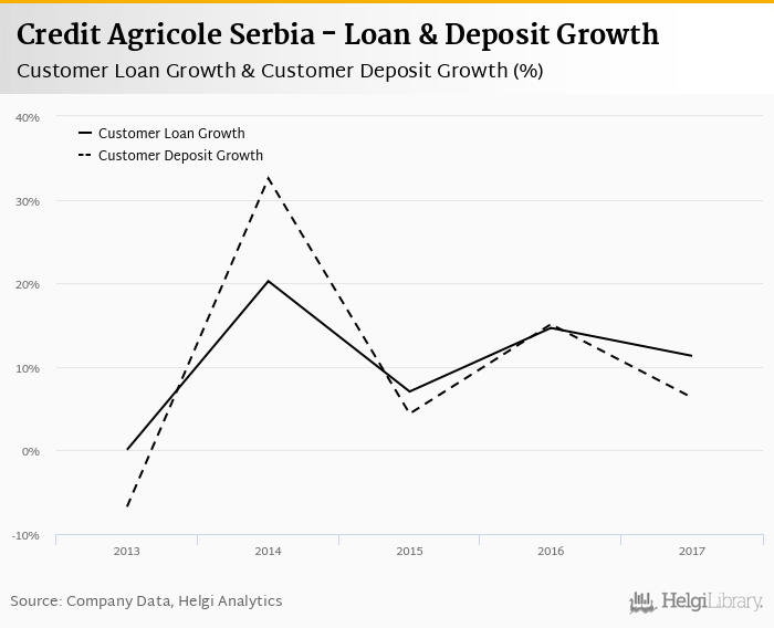 Credit Agricole Serbia's customer loan growth reached 11.3% in 2017, down from 14.7% compared to the previous year. Historically, the bank’s loans growth reached an all time high of 20.3% in 2014 and an all time low of 0.076% in 2013. In the last decade, the average annual loan growth amounted to 0%.