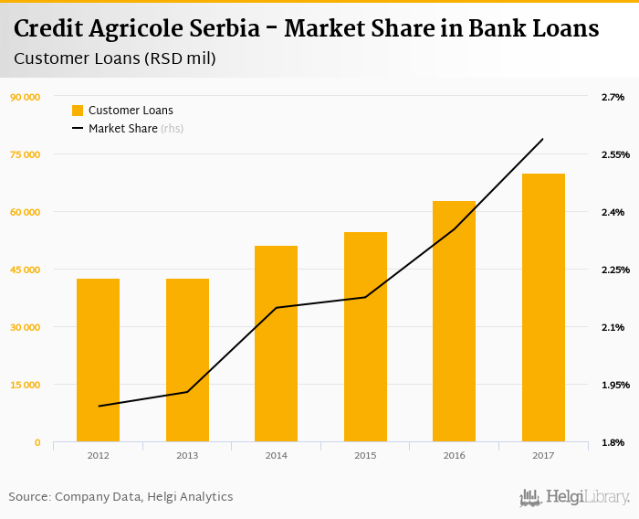 Credit Agricole Serbia's customer loans reached RSD 69,959 mil in 2017, up 11.3% compared to the previous year.