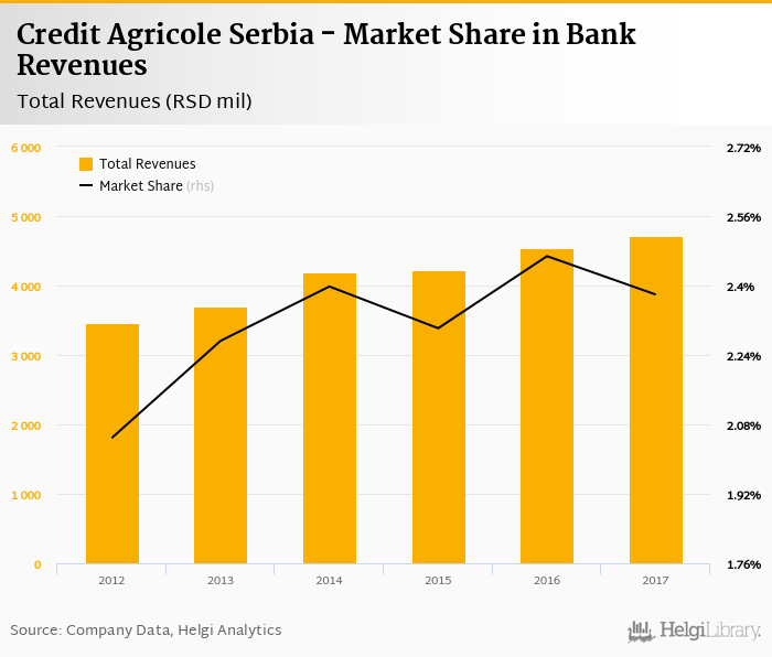 Credit Agricole Serbia generated total banking revenues of RSD 4,707 mil in 2017, up 3.57% compared to the previous year.