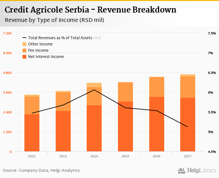 Credit Agricole Serbia generated total banking revenues of RSD 4,707 mil in 2017, up 3.57% compared to the previous year.