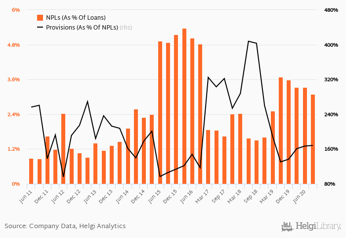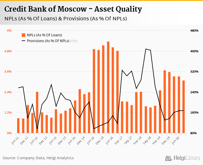 Credit Bank of Moscow's non-performing loans reached 3.09% of total loans at the end of 2020-09-30, down from 3.69% compared to the previous year. Historically, the NPL ratio hit an all time high of 5.37% in 2016-03-31 and an all time low of 0.863% in 2011-09-30.