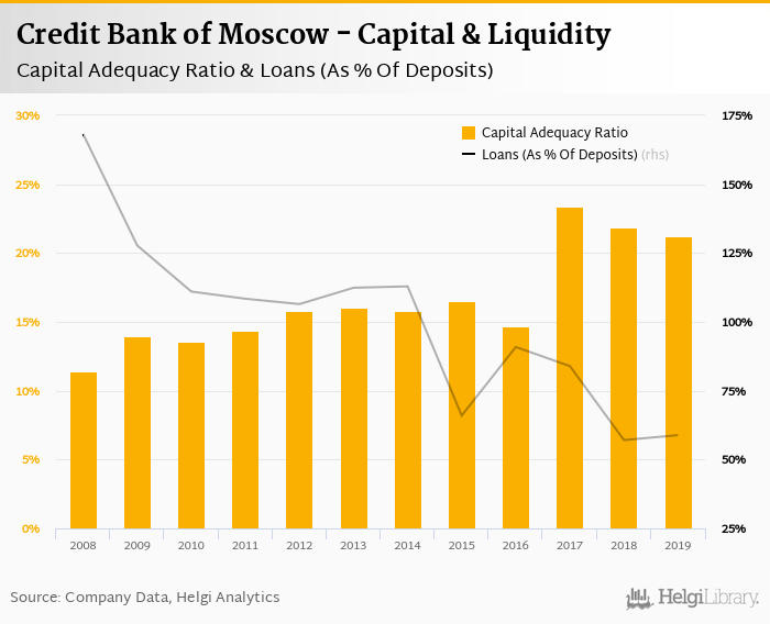 Credit Bank of Moscow's capital adequacy ratio reached 21.2% at the end of 2019, down from 21.9% compared to the previous year. Historically, the bank’s capital ratio hit an all time high of 23.4% in 2017 and an all time low of 11.4% in 2008.