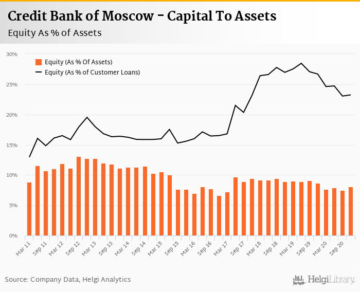 Credit Bank of Moscow's Equity reached 8.04% of total assets in the 4Q2020, down from 8.68% for the previous year. As a share of net customer loans, the ratio amounted to 23.2% at the end of the fourth quarter of 2020.