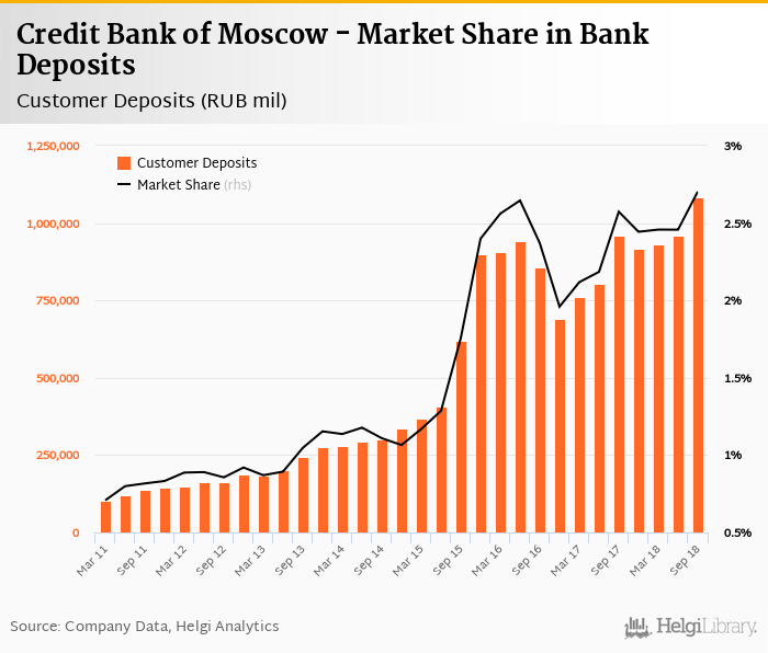 Credit Bank of Moscow's customer deposits reached RUB 1,084,320 mil in 2018-09-30, up 12.8% compared to the previous year.