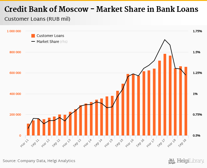 Credit Bank of Moscow accounted for 1.22% of all customer loans issued in Russia at the end of 2018-09-30. Historically, the bank’s market share in customer loans reached an all time high of 1.65% in 2017-09-30 and an all time low of 0.583% in 2011-03-31.