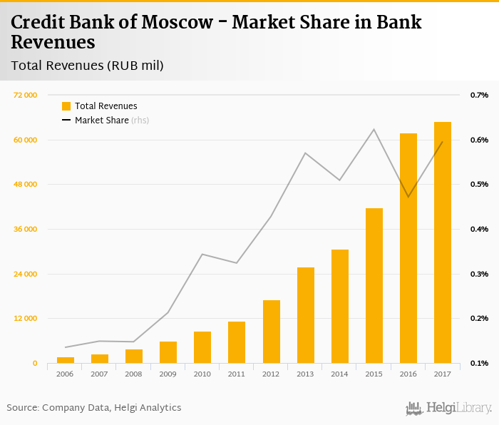 As a result, Credit Bank of Moscow accounted for 0.596% of all bank revenues generated by banks in Russia in 2017. Historically, the bank’s market share in total revenues reached an all time high of 0.623% in 2015 and an all time low of 0.135% in 2006.