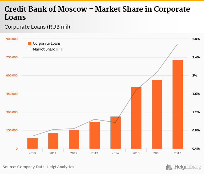 Credit Bank of Moscow's corporate loans reached RUB 731,105 mil in 2017, up 29.1% compared to the previous year.