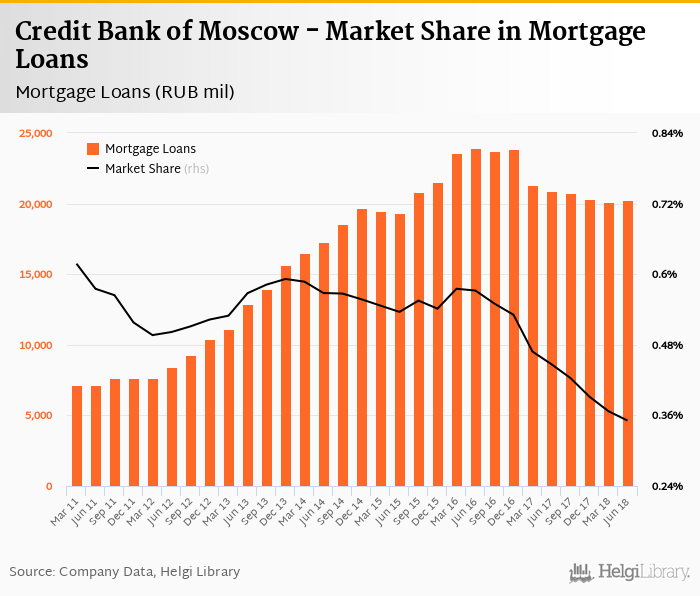 Credit Bank of Moscow's mortgage loans reached RUB 20,223 mil in 2Q2018, up 0.667% compared to the previous year.
