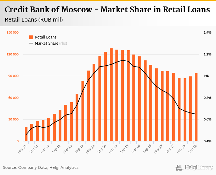 Credit Bank of Moscow's retail loans reached RUB 93,788 mil in the third quarter of 2018, up 4.53% compared to the previous year.