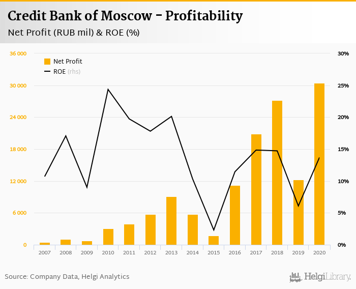 Credit Bank of Moscow made a net profit of RUB 30,463 mil in 2020, up 149% compared to the previous year. This implies a return on equity of 13.7%.