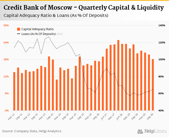 Credit Bank of Moscow's capital adequacy ratio reached 18.2% at the end of third quarter of 2020, down from 19.8% when compared to the previous quarter. Historically, the bank’s capital ratio hit an all time high of 24.9% in 1Q2018 and an all time low of 11.0% in 4Q2013.
