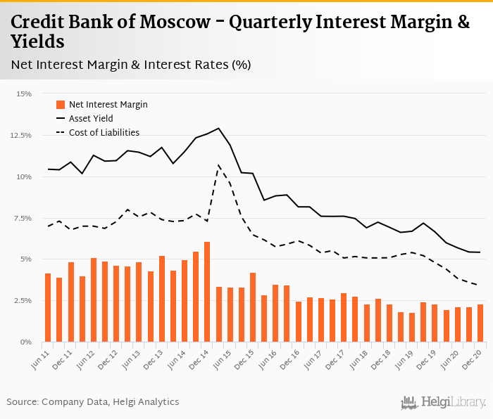 Credit Bank of Moscow's net interest margin amounted to 2.28% in the fourth quarter of 2020, up from 2.11% when compared to the previous quarter.