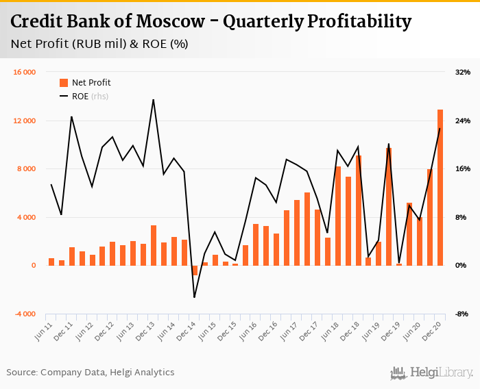 Credit Bank of Moscow made a net profit of RUB 12,940 mil in the fourth quarter of 2020, up 6% when compared to the same period of last year. This implies a return on equity of 22.7%.