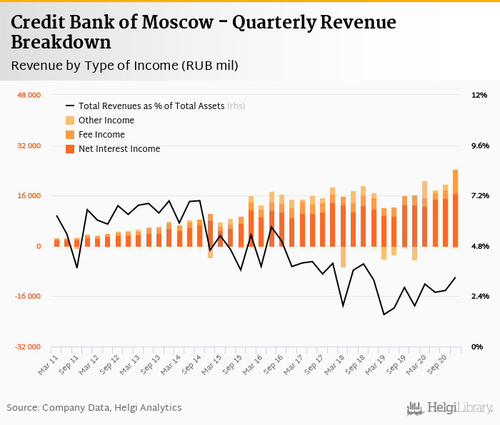 Credit Bank of Moscow generated total banking revenues of RUB 24,111 mil in the fourth quarter of 2020, up 105% when compared to the same period of last year and 22.2% when compared to the previous quarter.