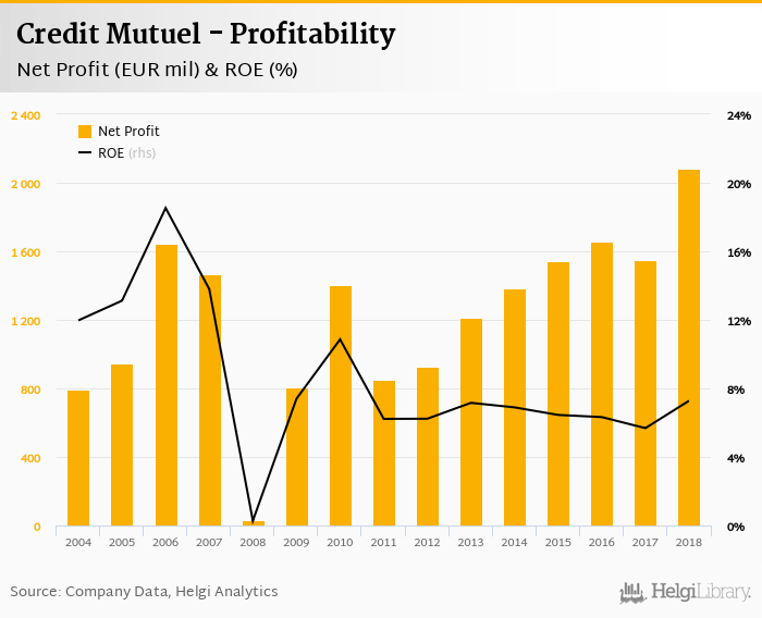 Credit Mutuel made a net profit of EUR 2,084 mil in 2018, up 34.5% compared to the previous year. This implies a return on equity of 7.28%.