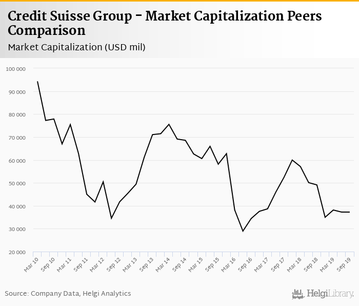 Credit Suisse Group stock traded at CHF 11.8 per share at the end of third quarter of 2019 implying a market capitalization of USD 37,231 mil.