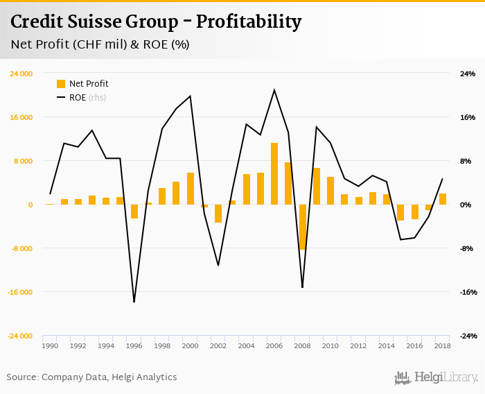 Credit Suisse Group made a net profit of CHF 2,024 mil in 2018, up 306% compared to the previous year. This implies a return on equity of 4.70%.