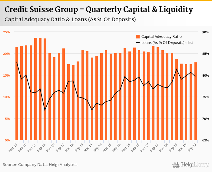 Credit Suisse Group's capital adequacy ratio reached 18.0% at the end of third quarter of 2019, up from 17.6% when compared to the previous quarter. Historically, the bank’s capital ratio hit an all time high of 23.7% in 1Q2011 and an all time low of 17.4% in 1Q2013.