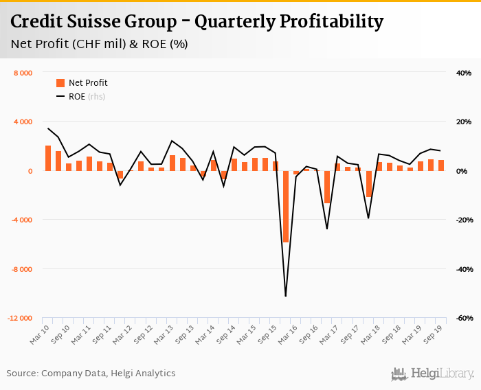 Credit Suisse Group made a net profit of CHF 881 mil in the third quarter of 2019, up 108% when compared to the same period of last year. This implies a return on equity of 7.90%.