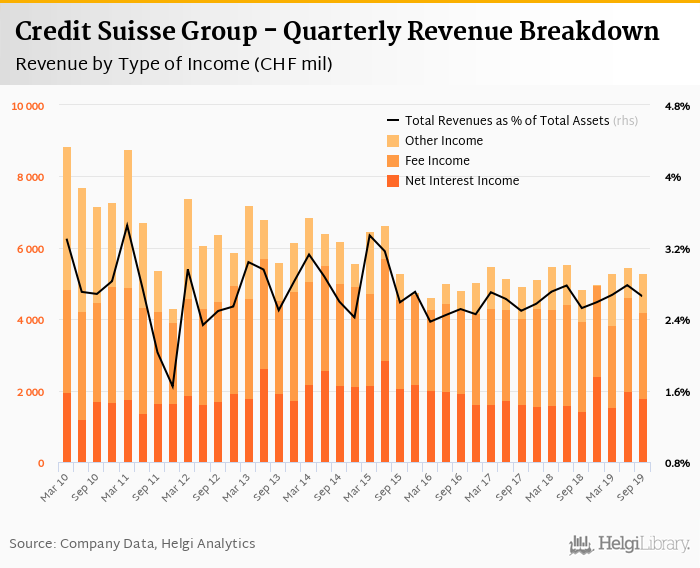 Credit Suisse Group generated total banking revenues of CHF 5,285 mil in the third quarter of 2019, up 8.95% when compared to the same period of last year and down 3.08% when compared to the previous quarter.