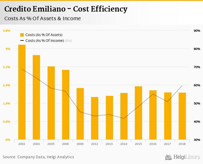 Credito Emiliano's cost to income ratio reached 59.6% in 2018, up from 50.8% compared to the previous year.