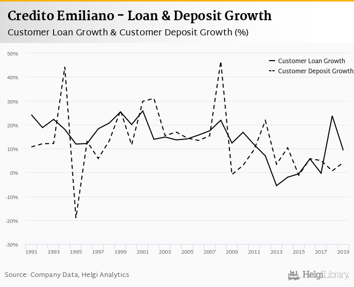 Credito Emiliano's customer loan growth reached 9.17% in 2019, down from 23.7% compared to the previous year. Historically, the bank’s loans growth reached an all time high of 25.8% in 2001 and an all time low of -5.55% in 2013. In the last decade, the average annual loan growth amounted to 6.20%.