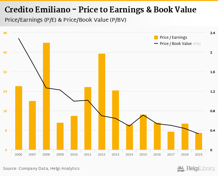 Credito Emiliano stock traded at EUR 2.11 per share at the end 2019 implying a market capitalization of USD 1,183 mil.