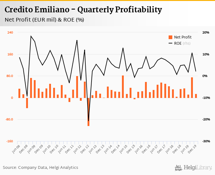 Credito Emiliano made a net profit of EUR 14.5 mil in the fourth quarter of 2019, down 55.2% when compared to the same period of last year. This implies a return on equity of 1.98%.