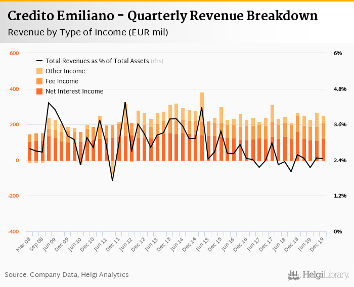 Credito Emiliano generated total banking revenues of EUR 252 mil in the fourth quarter of 2019, down 5.12% when compared to the same period of last year and 6.55% when compared to the previous quarter.