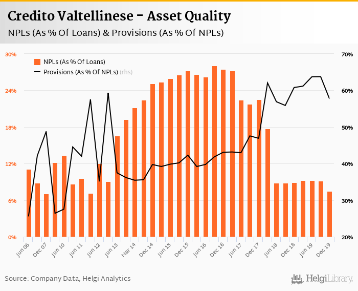 Credito Valtellinese's non-performing loans reached 7.52% of total loans at the end of 2019-12-31, down from 8.91% compared to the previous year. Historically, the NPL ratio hit an all time high of 28.1% in 2016-09-30 and an all time low of 7.03% in 2007-12-31.