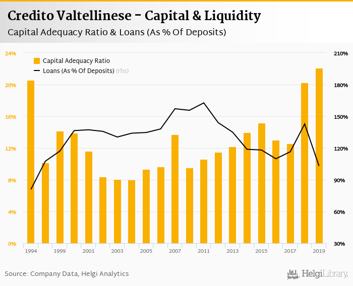 Credito Valtellinese's capital adequacy ratio reached 22.1% at the end of 2019, up from 20.3% compared to the previous year. Historically, the bank’s capital ratio hit an all time high of 22.1% in 2019 and an all time low of 8.03% in 2004.