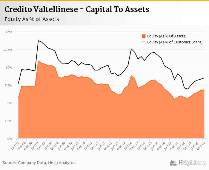Credito Valtellinese's Equity reached 6.80% of total assets in the 4Q2019, up from 5.92% for the previous year. As a share of net customer loans, the ratio amounted to 8.48% at the end of the fourth quarter of 2019.