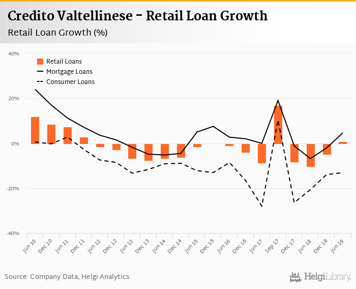 Credito Valtellinese's retail loans reached EUR 12,785 mil at the end of 2019-06-30, down 0% compared to the previous year. In the last decade, the average annual loan growth amounted to 0%.