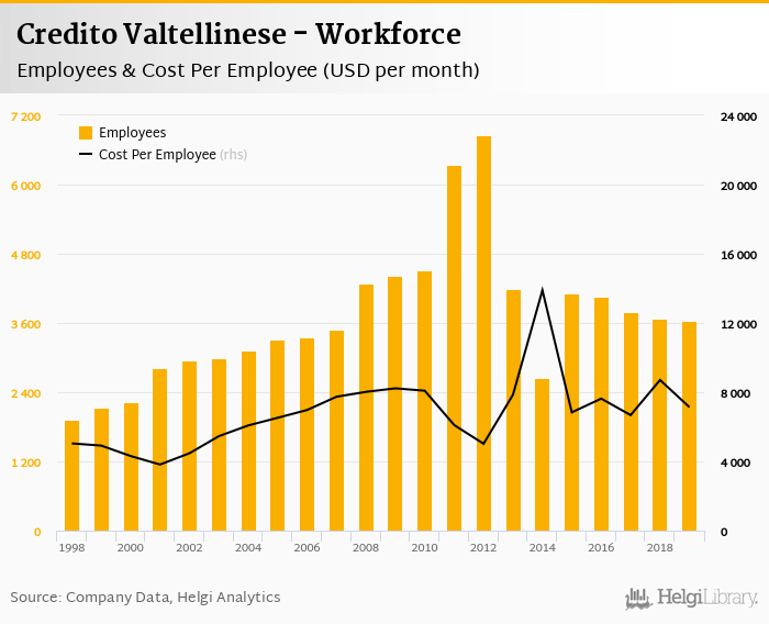 Credito Valtellinese employed 3,634 persons in 2019, down 0.927% when compared to the previous year. Historically, the bank's workforce hit an all time high of 6,854 persons in 2012 and an all time low of 1,930 in 1998.