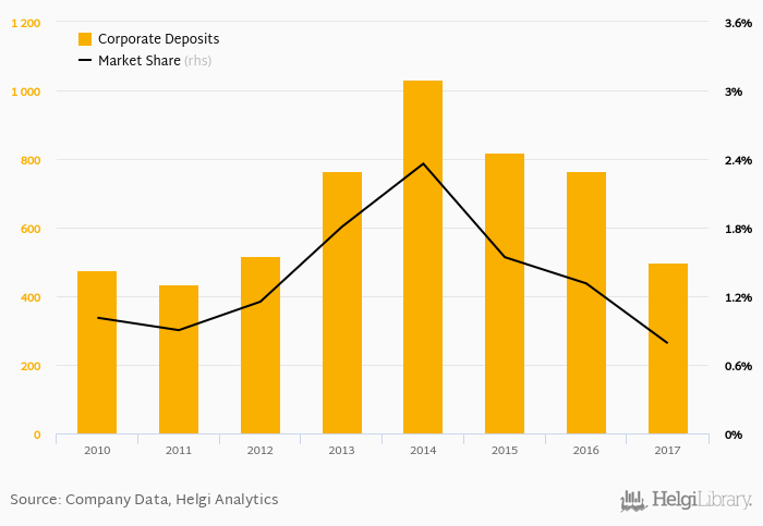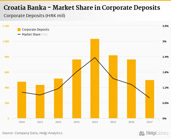 Croatia Banka's corporate deposits reached HRK 497 mil in 2017, down 34.9% compared to the previous year.