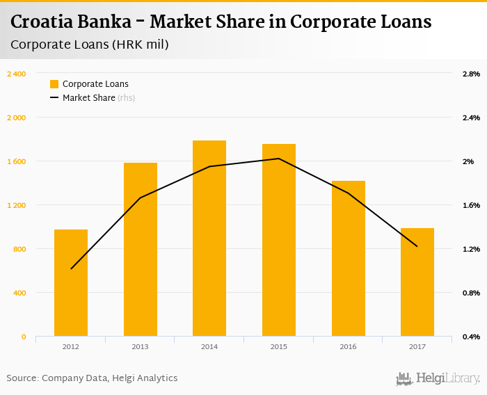Croatia Banka's corporate loans reached HRK 993 mil in 2017, down 30.0% compared to the previous year.
