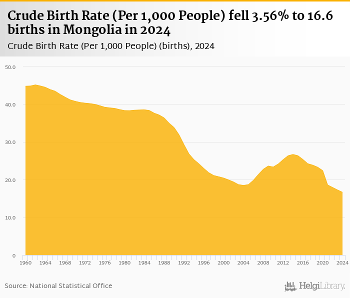 Crude birth rate per 1,000 people fell 12.4% to 16.6 births in Mongolia in 2024, according to the National Statistical Office.