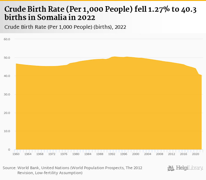 Crude birth rate per 1,000 people fell 1.27% to 40.3 births in Somalia in 2022, according to the National Statistical Office.
