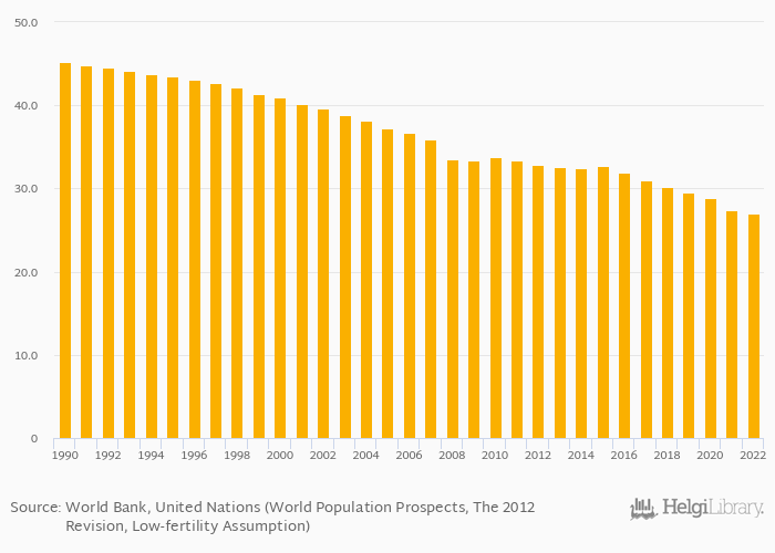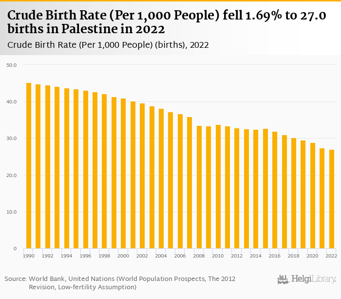 Crude birth rate per 1,000 people fell 1.69% to 27.0 births in Palestine in 2022, according to the National Statistical Office.