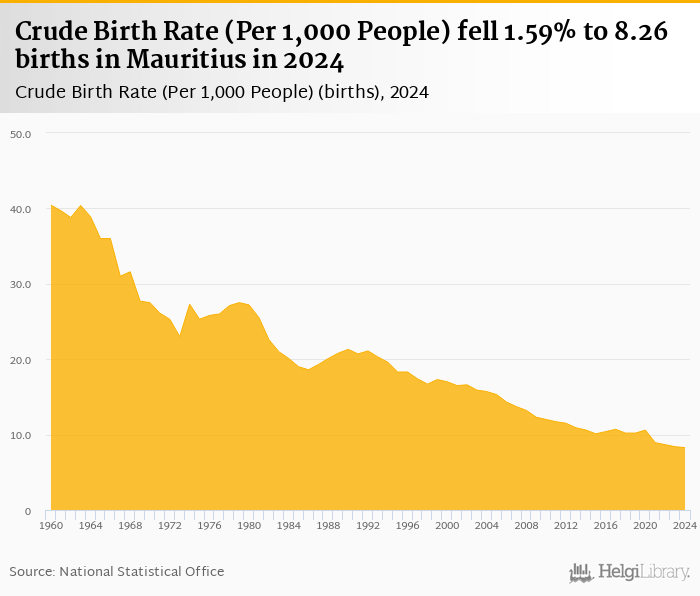 Crude birth rate per 1,000 people fell 19.0% to 8.26 births in Mauritius in 2024, according to the National Statistical Office.