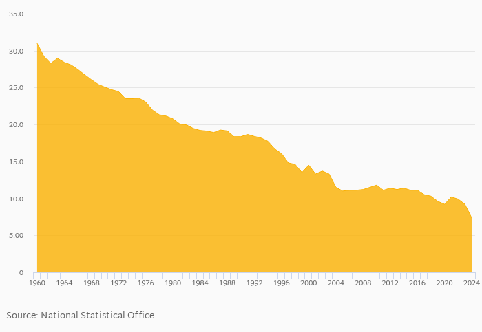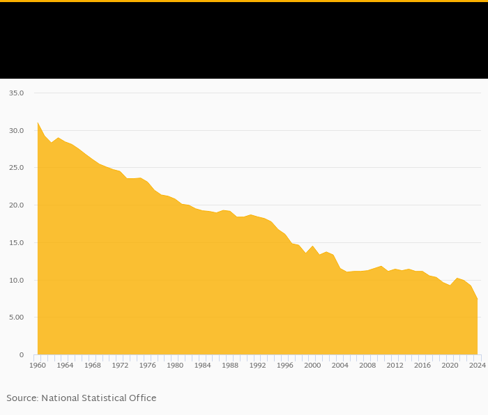 Crude birth rate per 1,000 people fell 20.0% to 7.36 births in Macedonia in 2024, according to the National Statistical Office.
