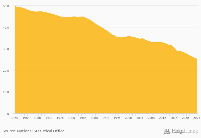 Historically, crude birth rate per 1,000 people in Ghana reached an all time high of 49.8 births in 1960 and an all time low of 25.4 births in 2024. When compared to Ghana's main peers, crude birth rate per 1,000 people in Benin amounted to 31.3 births, 31.8 births in Ivory Coast and 30.6 births in Togo in 2024.