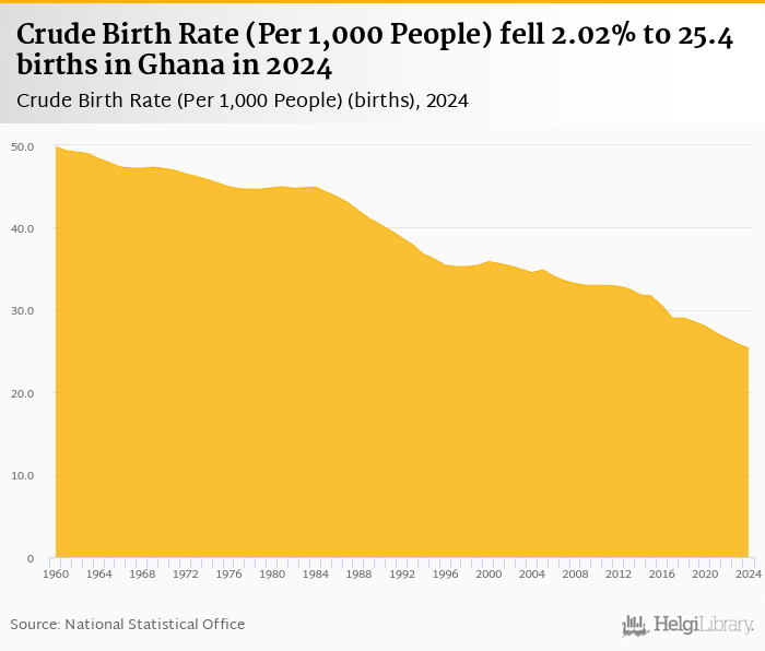 Crude birth rate per 1,000 people fell 2.02% to 25.4 births in Ghana in 2024, according to the National Statistical Office.
