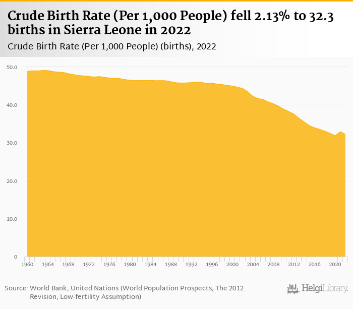 Crude birth rate per 1,000 people fell 2.13% to 32.3 births in Sierra Leone in 2022, according to the National Statistical Office.