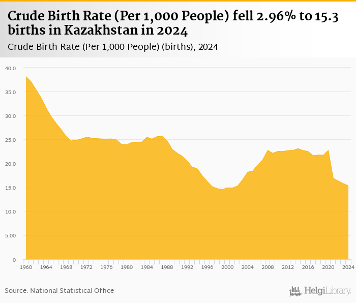 Crude birth rate per 1,000 people fell 23.8% to 15.3 births in Kazakhstan in 2024, according to the National Statistical Office.
