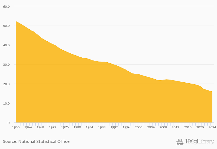 Historically, crude birth rate per 1,000 people in Dominican Republic reached an all time high of 52.2 births in 1960 and an all time low of 15.9 births in 2024. When compared to Dominican Republic's main peers, crude birth rate per 1,000 people in Cuba amounted to 6.60 births, 14.1 births in Jamaica, 13.5 births in Mexico and 10.5 births in USA in 2024.